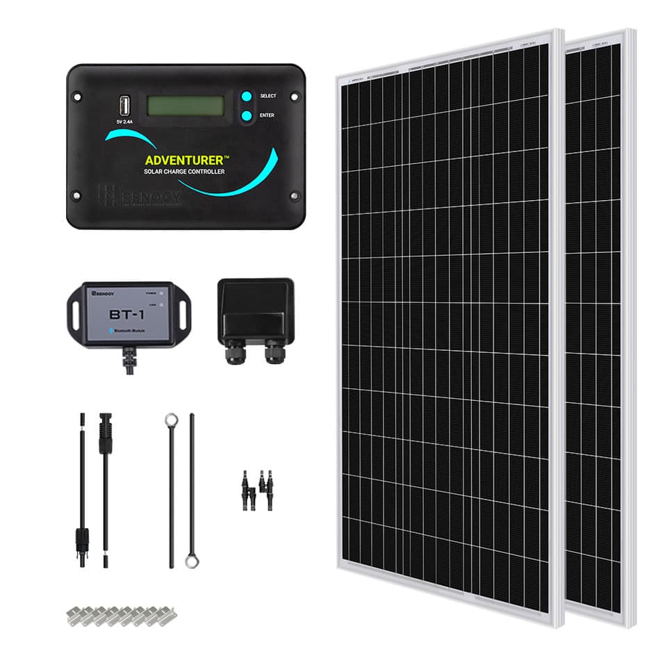 Take command of the off-grid solar world with the Renogy 600 Watt Premium Kit. Using our most efficient products we have put together a kit that can best suit your solar needs while on the go. This kit includes the new 100W Mono Solar Panel which is not only sleek in size, weight, and color but are made of the highest efficiency solar cells that Renogy has to offer.The included Rover Li 60A MPPT Charge Controller features multiphase synchronous rectification and Maximum Power Point Tracking technologies, which increases charging efficiency. Our new Bluetooth module is also included which can be paired to the Renogy BT App and Renogy DC Home App. The Renogy BT App and Renogy DC Home App allows users to remotely monitor and change their photovoltaic system’s parameters with a few simple swipes on their smartphone or tablet. For convenience, this kit also consists of six sets of mounting Z-Brackets, branch connectors, one 20ft 10AWG MC4 Adaptor Kit, one 8ft 4AWG Tray Cable, and fusing components for protection of your controller and battery.This Premium Kit is perfect for installation on an RV, boat, or camper. It can also be installed in a ground mount system next to an off-grid campsite, making it an ideal choice for many off-grid applications.